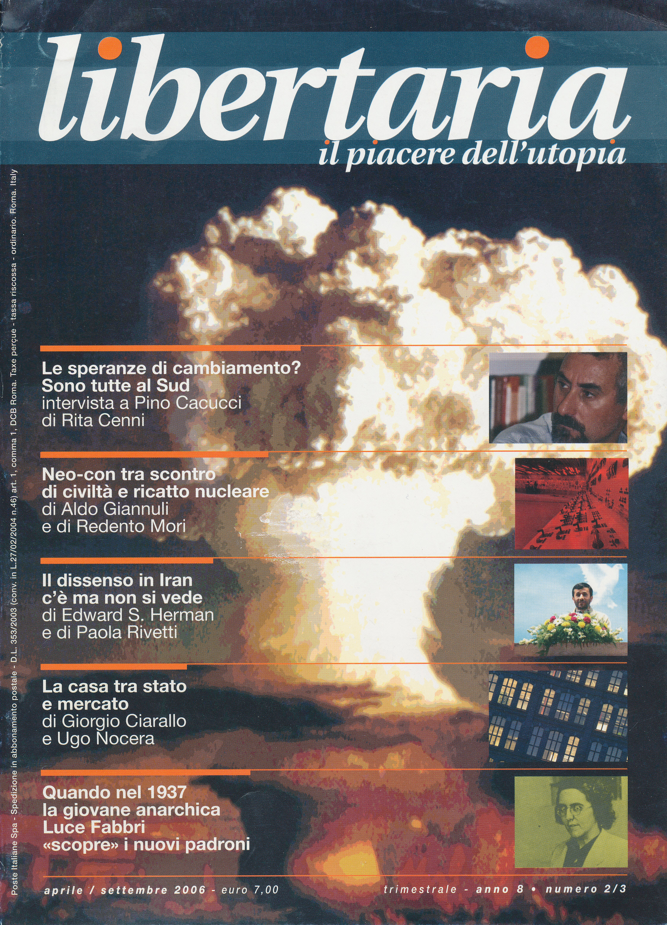 Redazione, Ci vorrebbe un pizzico di utopia; Redento Mori, Il ricatto nucleare; Aldo Giannuli, Quelli che... ripensano l'ordine mondiale; Paola Rivetti, Il dissenso dell'Iran? C'è ma non si vede; Edward S. Hermann, Come gli Stati Uniti creano il mostro; G. Soriano, Massimo Annibale Rossi, Villepin il precario sei tu; Massimo Annibale Rossi, Palestina: la battaglia di Shu'fat; Rita Cenni, C'è qualcosa di nuovo oggi nel Sud. Intervista a Pino Cacucci; Ugo Nocera, Giorgio Ciarallo, La casa tra stato e mercato; Michael Albert, Cos'è la rivoluzione; John Clark, Dominio transnazionale? Sì ma anche statuale; Francesco Codello, Métissage e islam; Lorenzo Pezzica, libraria / Quando nacque la Prima Internazionale; Josep Alemany, grande schermo / Nostalgia del paradiso perduto; Luce Fabbri, Bisogna dirlo.