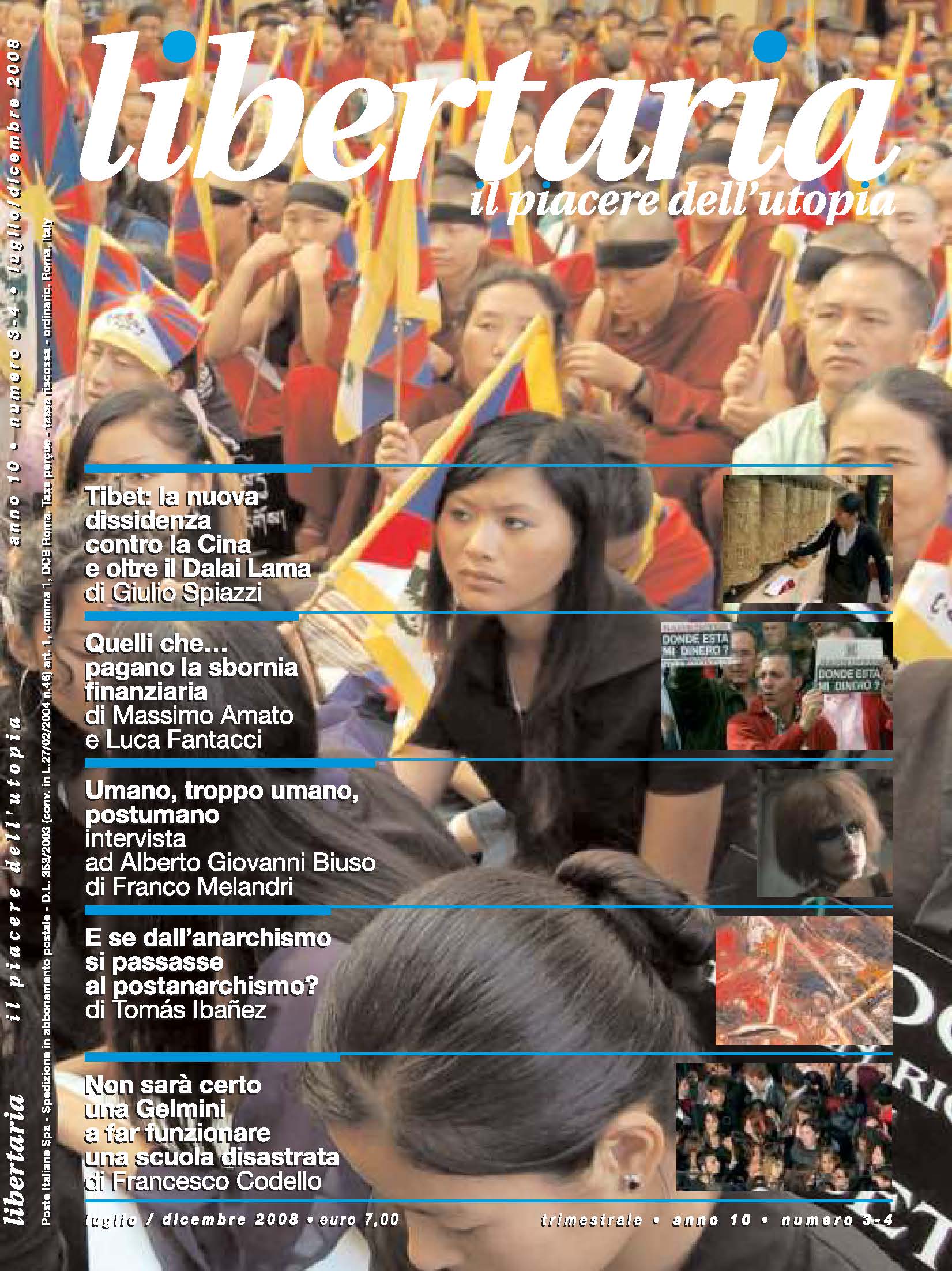Redazione, Fondazioni universitarie: e perché no?; Massimo Amato, Luca Fantacci, La sbornia finanziaria è finita; Giulio Spiazzi, La nuova dissidenza tibetana; Francesco Codello, La riforma è pessima, ma l'esistente è meglio?; Tomás Ibañez, Dall'anarchismo al postanarchismo; Uri Gordon, L'anarchismo declinato al presente; Franco Melandri, Umano, troppo umano, postumano. Intervista ad Alberto Giovanni Biuso; Carlo Ghirardato, Quel migrante, chiamato Joe Hill. Intervista a Lorenzo Marvelli; Aldo Giannuli,Il falso mito della geopolitica; Lorenzo Pezzica, Parole e suoni d'amore e d'anarchia; Franco Buncǔga, Una biennale al di là del costruire; Redazione, Notizie della cultura libertaria.