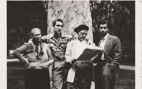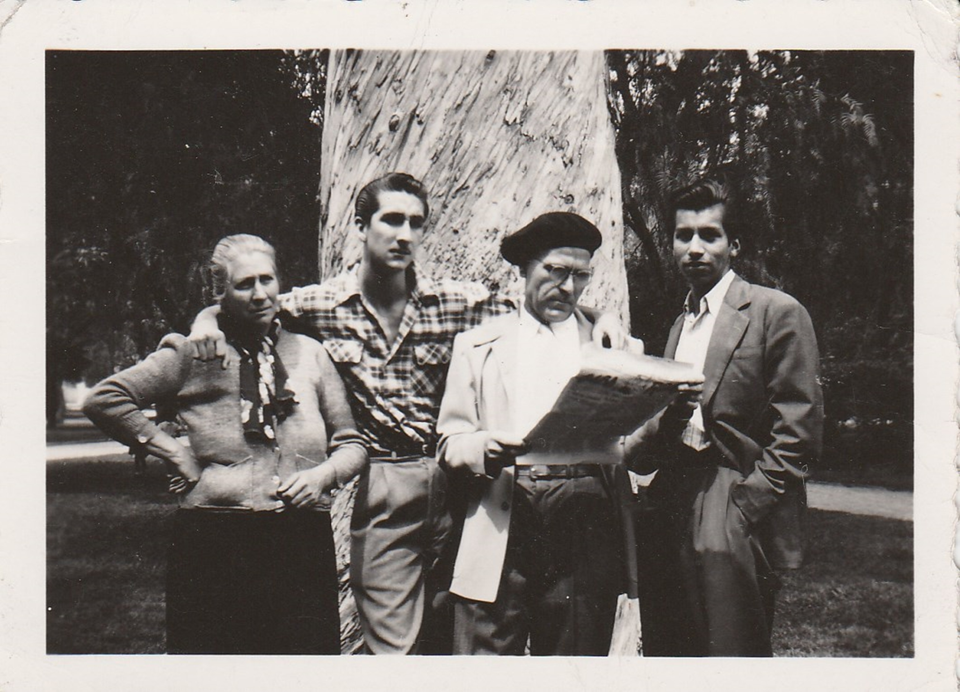 • México 1948: Octavio Alberola con i genitori e con Manuel González Salazar, in un giardino di Città del Messico, mentre leggiamo il giornale Alba roja, mesi prima del loro arresto