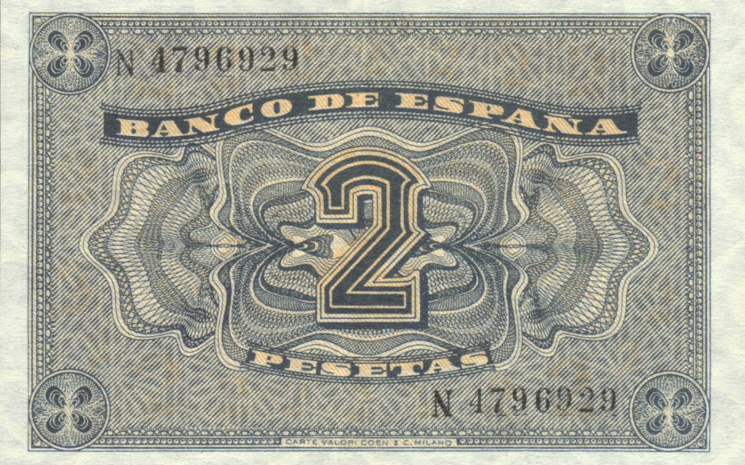 Durante la guerra civile spagnola i franchisti presero contatto con alcune aziende estere per stampare banconote che non erano in grado di emettere direttamente. Falliti i contatti con la ditta inglese che stampava cartamoneta per la repubblica si rivolsero alla Germania e all'Italia. Vennero quindi stipulati dei contratti con la Giesecke & Devrient di Lipsia e con la Coen & Cartevalori di Milano[1].