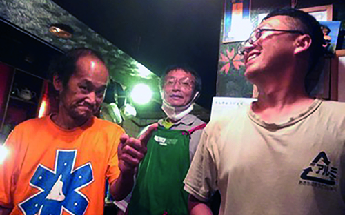Pepe-san (a sinistra), Kyūkyoku-san (al centro), Kaminaga-san (a destra) nel locale autogestito Waseda AkaneI Dame ren