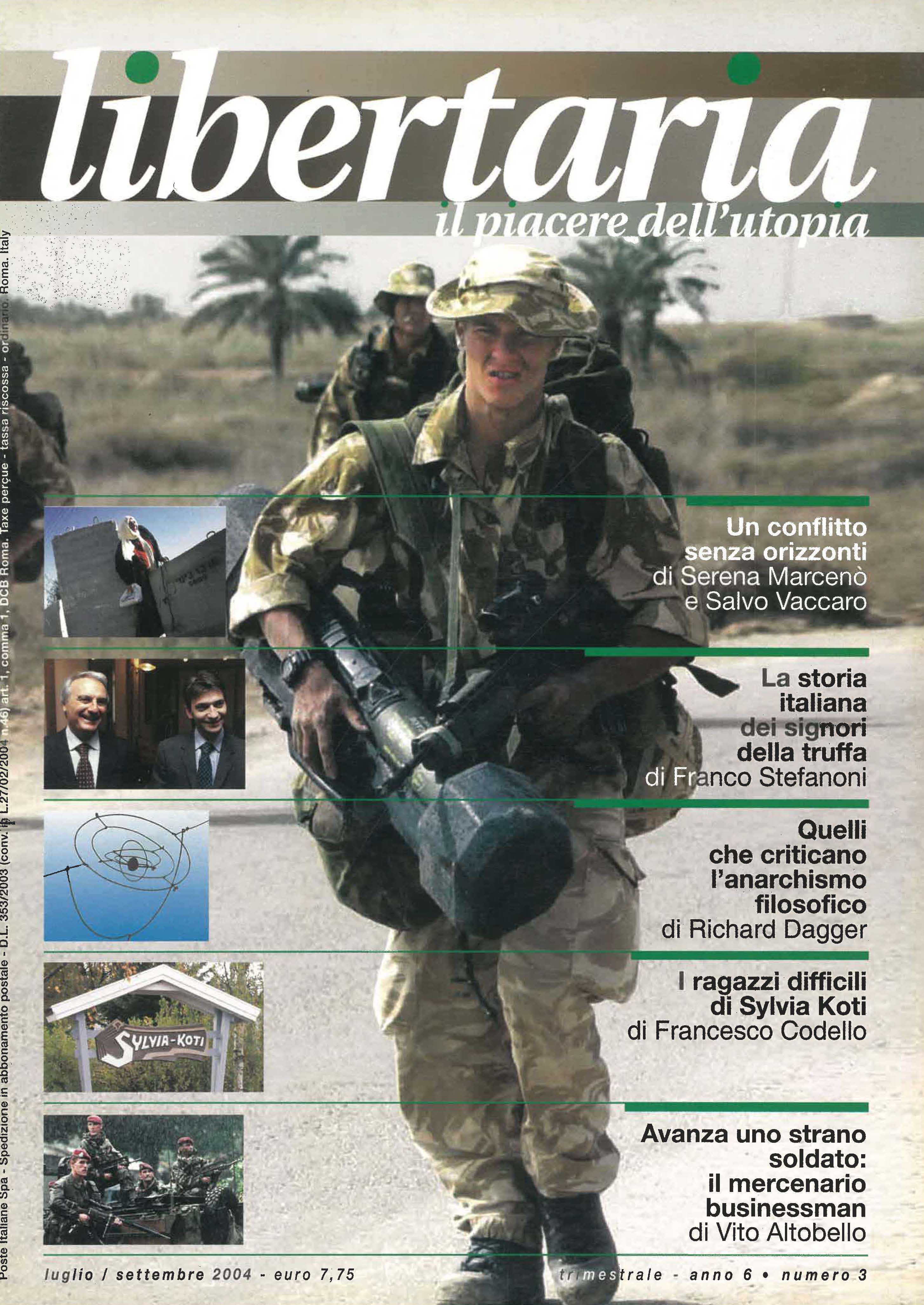Redazione, Riscopriamo la progettualità; Vito Altobello, Soldati di ventura; Franco Stefanoni, Aspettando la prossima Parmalat; Serena Marcenò, Salvo Vaccaro, Un conflitto senza orizzonti; Richard Dagger, L'anarchismo filosofico e i suoi errori; Francesco Codello, Quei ragazzi difficili di Sylvia Koti; Persio Tincani, L'istituzione negata; Eduardo Colombo, Sintesi revisionista e blocco neoliberale; Luigi Veronelli, Un «folle» errore da correggere; Colin Ward, Lo strano rapporto di Orwell con gli anarchici; Pietro Masiello, L'incredibile ritardo spagnolo; Claudio Venza, libraria / Sostiene Berti...su Malatesta; Francesco Berti,  libraria / Dalla città di Errico suona il «risveglio». Intervista a Piero Brunello e Filippo Benfante; Philippe Godard, grande schermo / Matrix: una cricitica al sistema?; Carlo Ghirardato, sipario / Il caso Passannante. Intervista a Ulderico Pesce; Redazione, Quelli che...costruiscono la pace con la scuola.